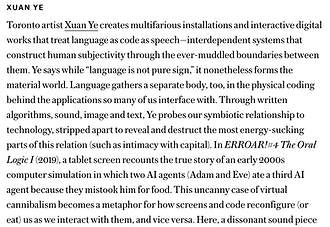 In the spring 2020 issue of Canadian Art, "Influence", Joy Xiang reviews Xuan Ye's three-part exhibition, Filling the Klein Bottle (updated April 1, 2020). "Through intentional collaboration with machines, Ye recoups agency. A low-frequency crackling permeated the small room of “The Oral Logic,” part of a generative music score Ye created with collaborator Jason Doell, like ASMR but in a register of minor terror.". Read more below.